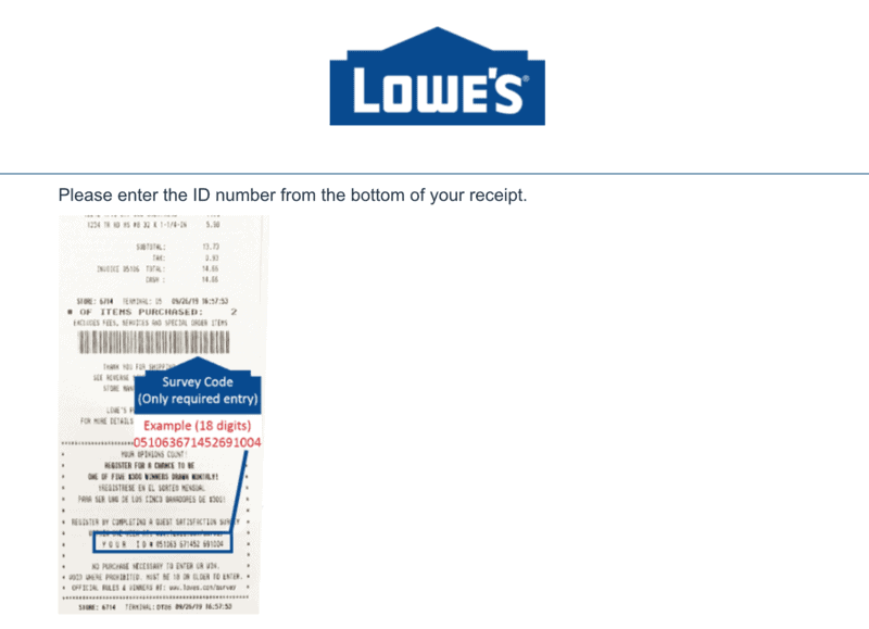 - A valid Lowe’s receipt with an 18-digit survey code is required for the online entry.